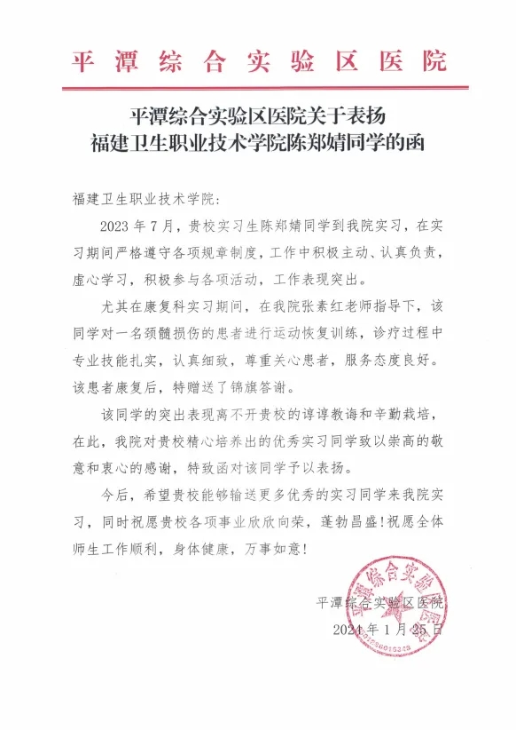 2024年1月25日,我校醫(yī)學院收到了一封來自學生實習單位平潭綜合實驗區(qū)醫(yī)院的表揚信,對在該醫(yī)院實習的陳鄭婧同學給予了高度評價。在實習期間,陳鄭婧同學服從實習醫(yī)院安排,并以最佳的精神狀態(tài)融入實習工作,在自己的崗位上兢兢業(yè)業(yè),將理論與實際緊密結合,高標準完成任務。