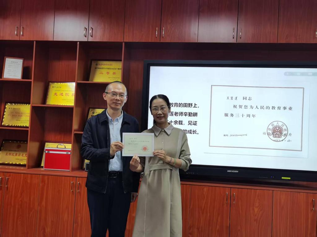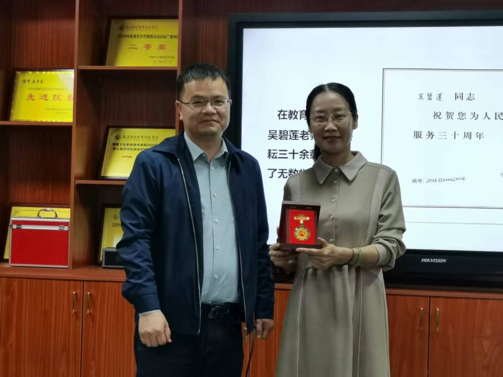 最后,傅衍達書記和鄧元榮院長分別為吳碧蓮老師頒發(fā)從教榮譽證書和退休紀(jì)念章,全體教職工以熱烈掌聲向這位堅守初心的教育者致以最高敬意。