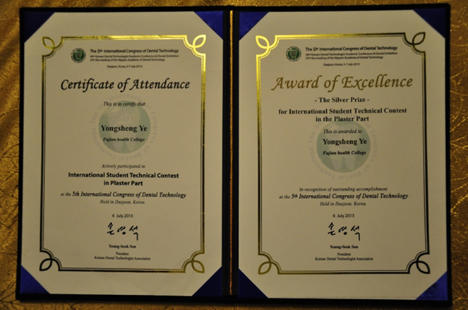 學(xué)生第五屆國(guó)際口腔技師學(xué)術(shù)大會(huì)(韓國(guó))口腔醫(yī)學(xué)技術(shù)專(zhuān)業(yè)石膏牙雕刻銀獎(jiǎng)