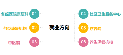各級(jí)各類康復(fù)醫(yī)療中心/醫(yī)院/門診、社區(qū)服務(wù)中心/衛(wèi)生院(所)、綜合醫(yī)院康復(fù)醫(yī)學(xué)科、中醫(yī)館、中醫(yī)健康管理機(jī)構(gòu)、醫(yī)養(yǎng)結(jié)合中心、養(yǎng)老服務(wù)機(jī)構(gòu)、兒童康復(fù)機(jī)構(gòu)、運(yùn)動(dòng)康復(fù)中心、產(chǎn)后康復(fù)中心、特殊教育學(xué)校、民政康復(fù)中心、兒童福利院、假肢矯形康復(fù)中心、美容機(jī)構(gòu)、康復(fù)器械企業(yè)等從事康復(fù)治療與服務(wù)等工作。近三年畢業(yè)生整體就業(yè)率達(dá)到95%。