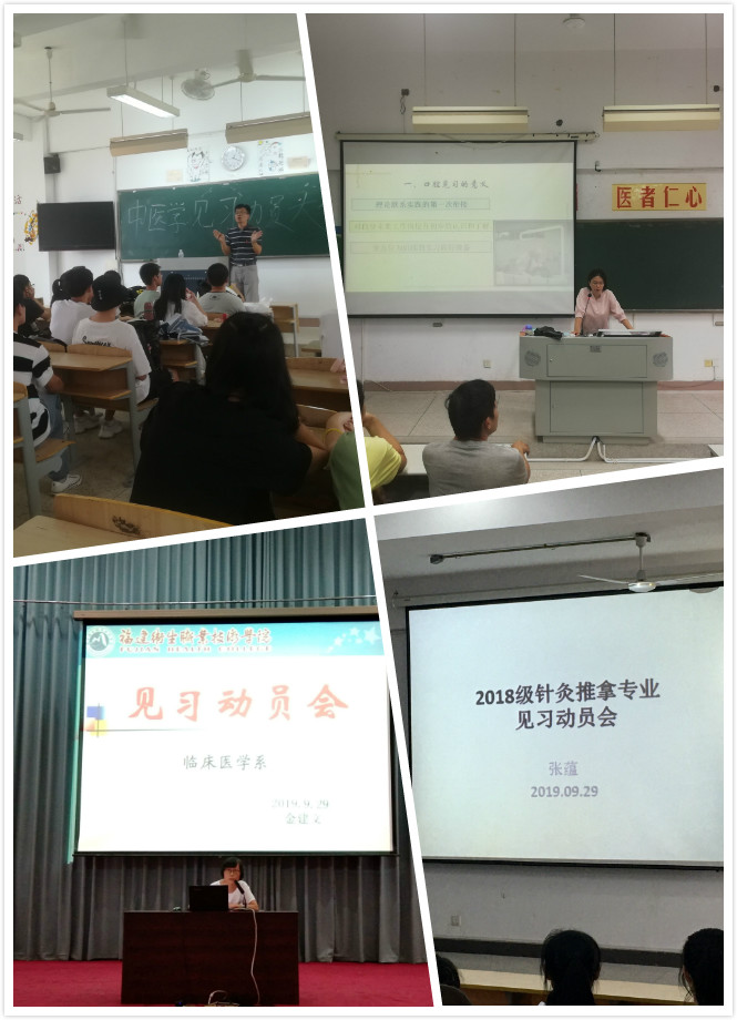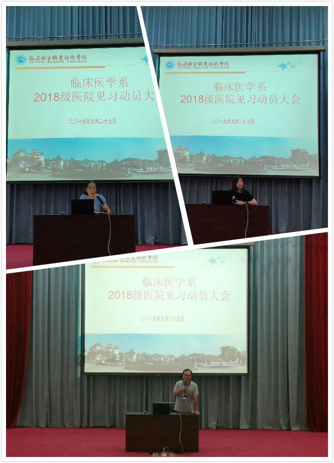 為促進(jìn)我系18級(jí)學(xué)生見習(xí)工作的順利進(jìn)行,讓同學(xué)們對見習(xí)有更加深刻的了解,臨床醫(yī)學(xué)系于9月29日中午在學(xué)術(shù)廳開展18級(jí)學(xué)生見習(xí)動(dòng)員大會(huì),實(shí)踐科陳瑜老師、系黨總支副書記陳潔、臨床醫(yī)學(xué)系副主任林國威、臨床醫(yī)學(xué)金建文老師、針灸推拿張?zhí)N老師、口腔醫(yī)學(xué)馬清璇老師、中醫(yī)學(xué)陳銘老師、18級(jí)輔導(dǎo)員及學(xué)生參加此次動(dòng)員大會(huì)。
