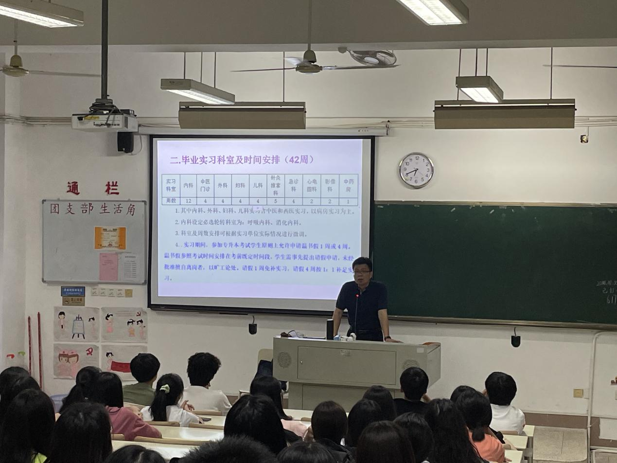 動員大會上,陳潔副書記從紀律管理等方面對同學們提出了要求,強調(diào)了實習期間的請假制度、紀律問題、財產(chǎn)安全等,并指導使用實踐管理平臺進行請假等手續(xù)。林國威副主任激勵同學們要胸懷大局,提高眼界與格局,不忘初心努力成為你想成為的好醫(yī)生。陳銘副主任強調(diào)實習中要不忘理論學習,理論與實踐相結(jié)合,為畢業(yè)后執(zhí)業(yè)助理醫(yī)師考試做準備。