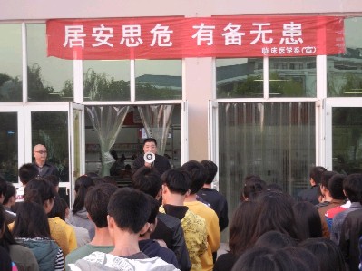 為貫徹落實(shí)學(xué)院關(guān)于加強(qiáng)校園安全工作的精神,增強(qiáng)學(xué)生的安全意識,提高學(xué)生的避險(xiǎn)能力和逃生能力,11月19日下午我系在12級學(xué)生中舉行了以“居安思危有備無患”為主題的防震逃生演練。院保衛(wèi)處林一蘇處長,臨床醫(yī)學(xué)系邱滾忠書記親臨現(xiàn)場指導(dǎo)演練活動。