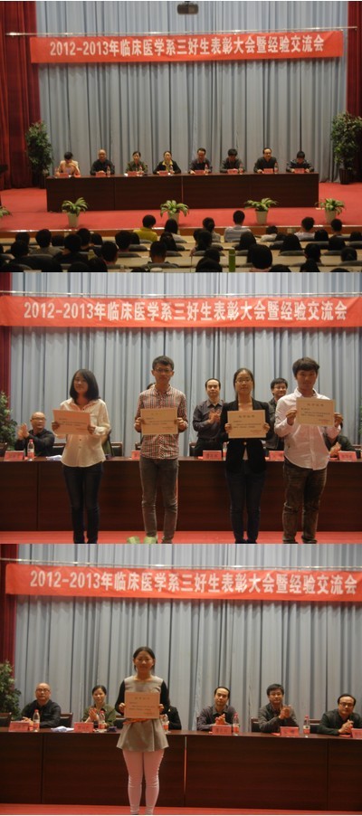 為激勵(lì)2012-2013學(xué)年先進(jìn)集體及先進(jìn)個(gè)人,“2012-2013學(xué)年臨床醫(yī)學(xué)系三好生表彰大會(huì)暨經(jīng)驗(yàn)交流會(huì)”于 11月 6 日下午在學(xué)術(shù)廳隆重舉行。院學(xué)生工作處處長(zhǎng)黃銘珊,院團(tuán)委副書記宋維,臨床醫(yī)學(xué)系黨總支書記邱滾忠,系主任潘在興、鄭向紅,副主任林國(guó)威,主任助理林浩,系團(tuán)總支書記邱萍,全體輔導(dǎo)員,以及2012級(jí)、2013級(jí)學(xué)生代表參加了本次大會(huì)。大會(huì)由系團(tuán)總支書記邱萍老師主持。