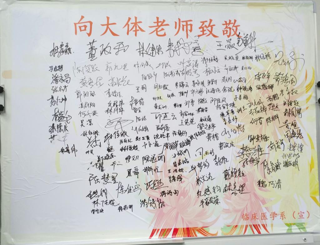 “大體老師”是醫(yī)學(xué)界對(duì)遺體捐贈(zèng)者的尊稱。這些遺體捐獻(xiàn)者用他們的軀體,讓學(xué)生們直觀了解人體基本知識(shí),是醫(yī)學(xué)學(xué)生的無(wú)語(yǔ)良師?;顒?dòng)開(kāi)始,學(xué)生代表周天陽(yáng)和鄭妍冰同學(xué)分別帶來(lái)朗誦與感悟共享,醫(yī)學(xué)教育離不開(kāi)人體標(biāo)本,正是有了大體老師的無(wú)私奉獻(xiàn),才能培養(yǎng)出醫(yī)術(shù)精湛的大夫。接著,全體老師與學(xué)生為大體老師默哀一分鐘,追思推動(dòng)醫(yī)學(xué)教育事業(yè)發(fā)展的無(wú)語(yǔ)良師,為這份無(wú)言的奉獻(xiàn)表達(dá)最崇高的敬意,并敬獻(xiàn)菊花,在活動(dòng)簽字墻簽字留念。