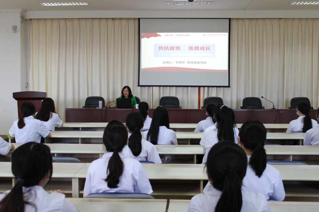 專題課圍繞當下的疫情防控展開,分為三個部分:中央統(tǒng)一領導、精準施策;疫情防控取得顯著成效、學校周密部署、分工明確,打響疫情防控的主動戰(zhàn)和青春書寫擔當、積極踐行,奮斗中做最美白衣天使。李美華副書記為大家簡要回顧了疫情經過,用詳盡的數(shù)據(jù)列出了打贏疫情防控阻擊戰(zhàn)必勝信心之所在;同時從組織領導、宣傳引導和監(jiān)督檢查三個方面講述了學院為戰(zhàn)“疫”所做的努力,特別是學院校友馳援武漢、在基層一線戰(zhàn)“疫”的故事感動了在場的學子們。她用鐘南山院士“選擇醫(yī)學可能是偶然,但你一旦選擇了,就必須用一生的忠誠和熱情去對待它”來勉勵大家在醫(yī)學的道路上奮勇前進。專題課在《提燈女神》的優(yōu)美歌聲中結束。