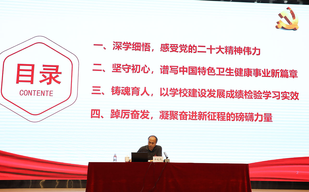 許能鋒以《砥礪奮進(jìn)啟新程 不忘初心鑄輝煌》為題,圍繞“深學(xué)細(xì)悟,感受黨的二十大精神偉力”“堅(jiān)守初心,譜寫(xiě)中國(guó)特色衛(wèi)生健康事業(yè)新篇章”“鑄魂育人,以學(xué)校建設(shè)發(fā)展成績(jī)檢驗(yàn)學(xué)習(xí)實(shí)效”“踔厲奮發(fā),凝聚奮進(jìn)新征程的磅礴力量”四個(gè)方面,對(duì)黨的二十大精神進(jìn)行全面宣講和深入解讀。同時(shí),還結(jié)合我校的辦學(xué)特色,重點(diǎn)展示了在黨的領(lǐng)導(dǎo)下,學(xué)校十年來(lái)的建設(shè)發(fā)展成就。他強(qiáng)調(diào),學(xué)習(xí)好、宣傳好、貫徹好黨的二十大精神,是當(dāng)前和今后一個(gè)時(shí)期的首要政治任務(wù)。要學(xué)深悟透,通過(guò)全面學(xué)習(xí)、全面把握、全面落實(shí),迅速興起學(xué)習(xí)貫徹黨的二十大精神熱潮。