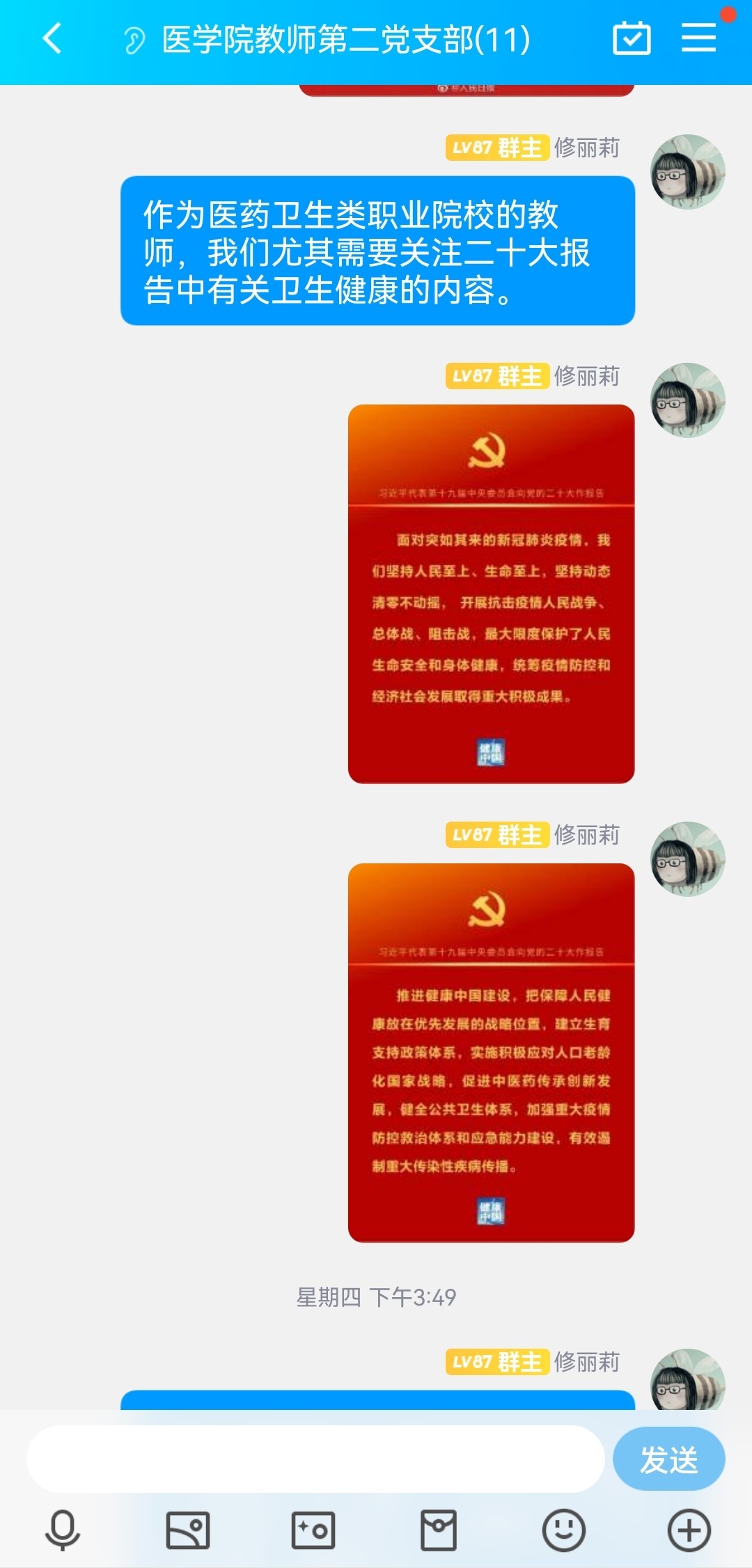 修麗莉在支部工作群在線組織學(xué)習(xí)習(xí)近平總書記在黨的二十大上作的報(bào)告和大會(huì)精神,本次學(xué)習(xí)主要聚焦黨的二十大報(bào)告中有關(guān)衛(wèi)生健康的內(nèi)容。她認(rèn)為,黨的二十大報(bào)告強(qiáng)調(diào),推進(jìn)健康中國(guó)建設(shè),把保障人民健康放在優(yōu)先發(fā)展的戰(zhàn)略位置。作為醫(yī)藥衛(wèi)生類職業(yè)院校的教師,我們需要關(guān)注和思考,如何為醫(yī)療衛(wèi)生健康行業(yè)培養(yǎng)更多的合格專業(yè)人才。